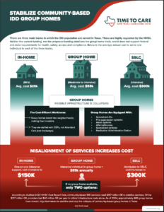 “State-supported IDD group homes save Texans money, because the overall cost of care is significantly lower than in the larger state institutions. Disabled individuals are able to receive personalized care in a home environment. They can often live closer to their families, allowing for more frequent visits, and are more easily integrated into community activities…